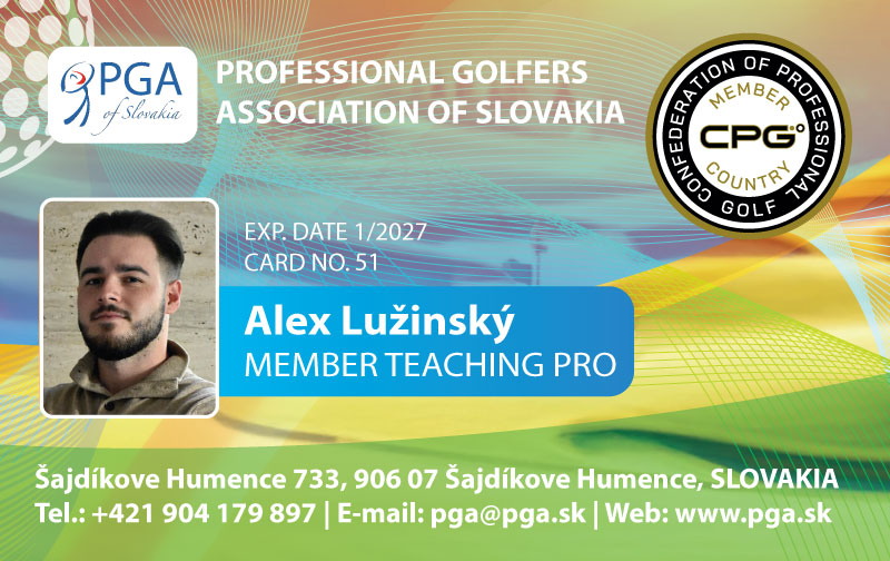 Lužinský Alex Kvalifikácia: Teaching PRO Klub: Welten Golf Club Rok narodenia: 1997 Email: *protected email* Telefón:+421 904 147 877 Web: